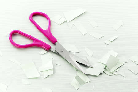 on a light background scissors cut off a piece of paper inscription