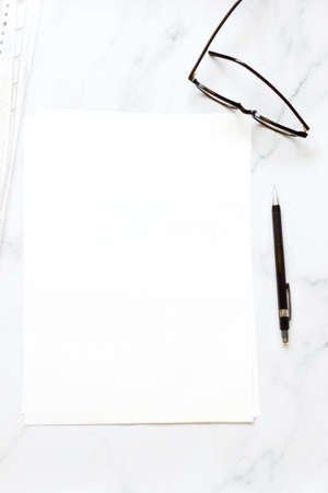 A sheet of white paper and a black pencil on a gray background closeup. Mockup