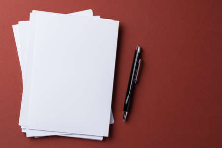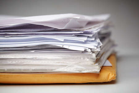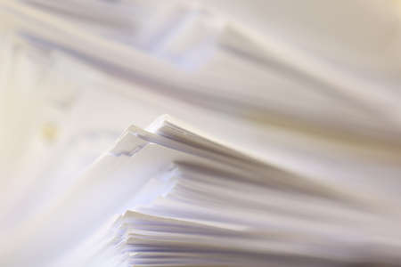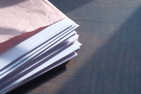 Mock up, stack of papers documents in archives files with paper clips on desk at offices, business concept.