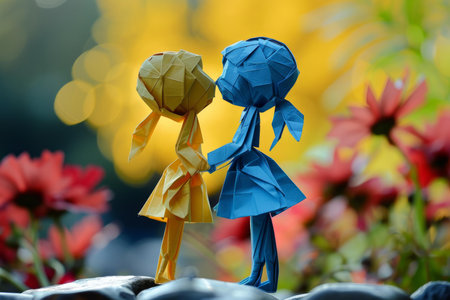 Colorful origami figures of a couple in a romantic setting surrounded by vibrant flowers