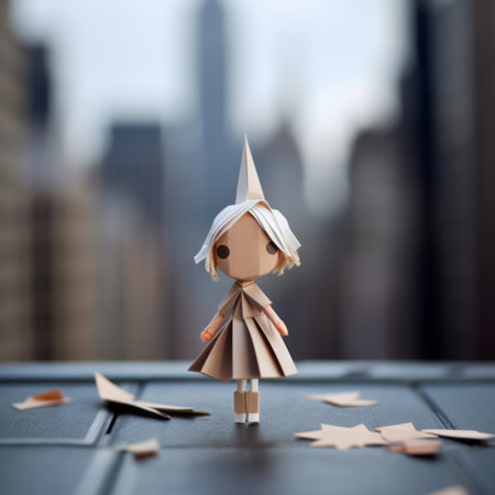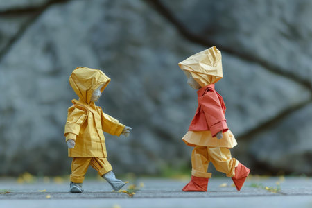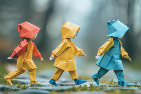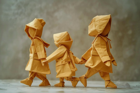 A family of origami figures in hooded cloaks, hand in hand, showcasing delicate paper craftsmanship