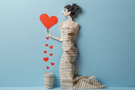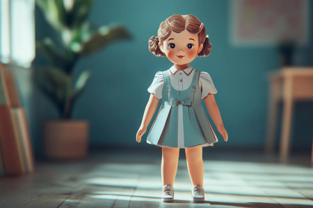 A delightful retro doll, wearing a charming cut-out outfit, stands gracefully in a sunlit room. The soft, pastel colors and vintage design evoke feelings of whimsy and nostalgia, inviting smiles.