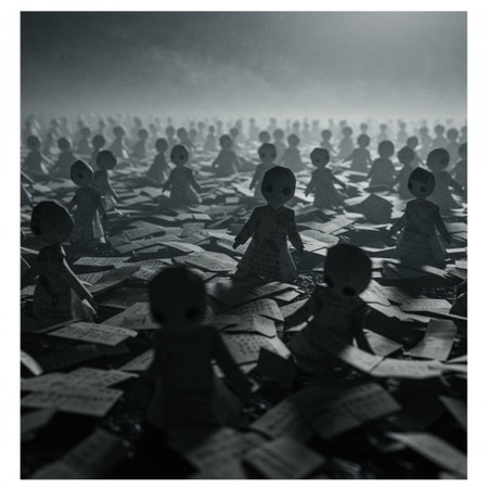Exploring a captivating paper art installation, viewers encounter dolls adorned with various notes and messages.