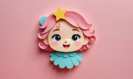 A paper craft girl with pink hair and a blue collar smiles brightly, a yellow star adorning her head