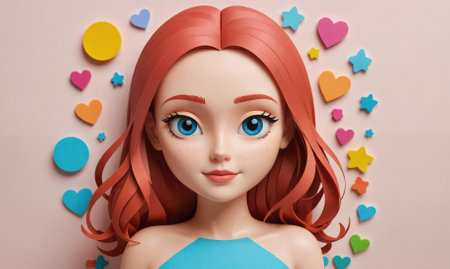 A 3D model of a young woman with red hair smiles surrounded by colorful hearts and stars