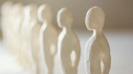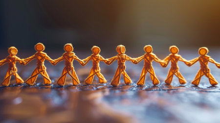 A close-up captures paper figures joined together, symbolizing community and collaboration. The figures display a variety of warm tones, set against a dark backdrop. The composition suggests teamwork and togetherness. This image could be used in projects focusing on social issues or educational materials.