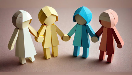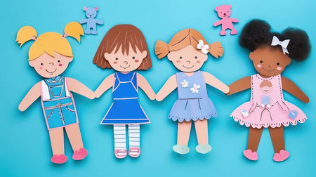 A charming illustration of diverse friends holding hands, showcasing creativity and unity through colorful paper cutouts. Perfect for themes of friendship and community.