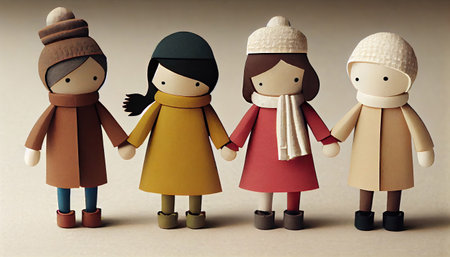Colorful winter dolls holding hands in a playful setting, showcasing vibrant patterns and a soft pastel background, ideal for seasonal decorations and child friendly themes