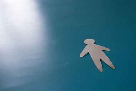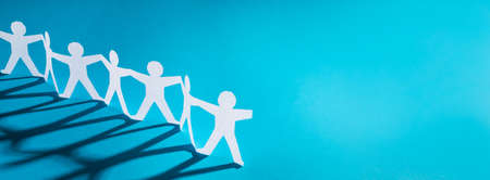 Team of paper chain people. Human chain with light and shadow. Blue tone background.