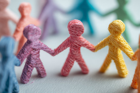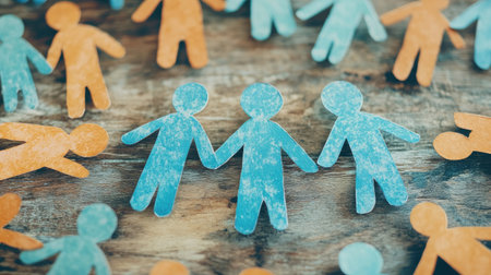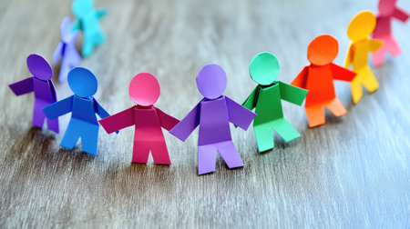 A group of colorful paper figures holding hands, symbolizing unity and diversity, arranged on a wooden surface, conveying themes of friendship and community in an artsy design.