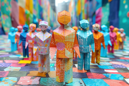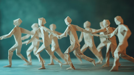 Paper origami individuals assemble in a unique pattern, A mosaic of origami people, coming together to form a harmonious whole