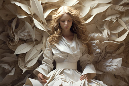 In a peaceful indoor setting, a beautifully crafted papier-mache doll captivates with its detailed features. Set against a backdrop of lush greenery, the doll embodies whimsy and artistry.