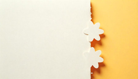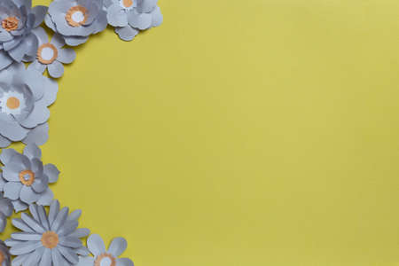 Flat lay frame of grey color paper flowers design on yellow background. Top view, copy space, floral art