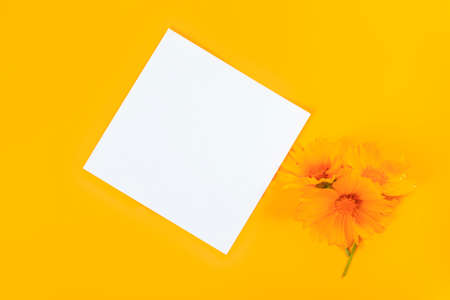 Invitation or greeting card mockup with blank sheet and yellow summer coreopsis flowers on yellow background. top view