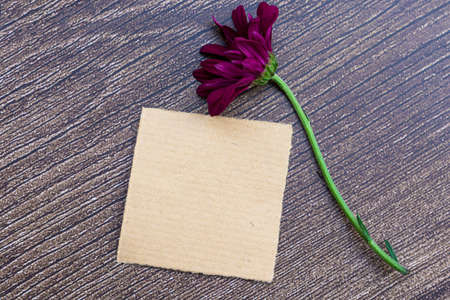 Brown note on wooden surface and flower flat lay with copy space. Directly above.