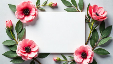 mockup card with plants. invitation card with environment and details Mockup with postcard and flowers on white background.