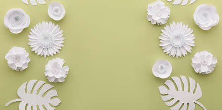Composition with beautiful paper flowers and leaves on color background with space for text