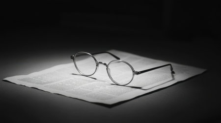 A serene composition featuring glasses atop an open page of a book, bathed in soft light, evoking a sense of contemplation and quiet learning.