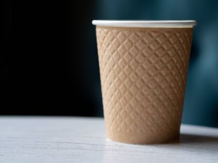 disposable white cardboard cups stand on a wooden table on a brown background