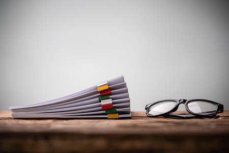 Stacked Documents With Colorful Paperclips And Eyeglasses