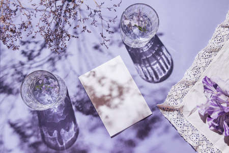 Two glasse with water and card note with iris flower on pastel lilac background with white cloth and shadows. Summer refreshment concept. Sunlit flat lay. Minimal style. Top view