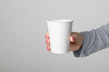 Female hand holding blank empty take away paper cup on neutral grey wall background