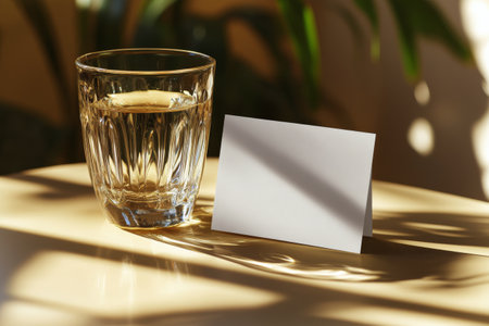 A clear glass filled with water rests on a marble table beside a blank card. Sunlight streams in, casting gentle shadows in a warm and inviting indoor space.