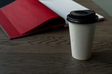 Morning coffee and a book. A white disposable coffee cup with a black lid on a wooden table with open book in a background.