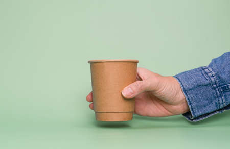male hand holding red paper disposable cup on green background, concept eco-friendly, zero waste