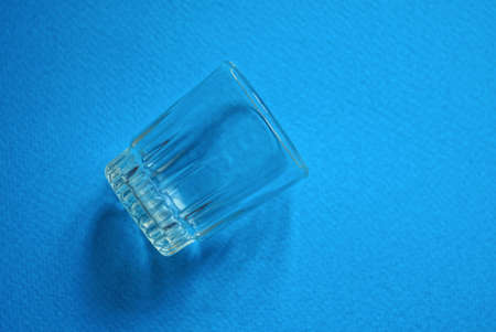one small empty glass shot lies on a blue table
