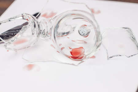broken wine glass on a plate kitchenware wooden table
