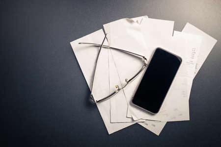 Mobile phone on bills on the desk with eyeglasses, smart phone for payment or calculation, financial or tax concept