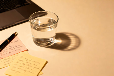 A glass of water on a desk with a laptop and a note