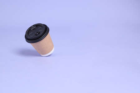 Eco-friendly disposable tableware for street drinks. Single lilac paper cup for coffee on a purple background.