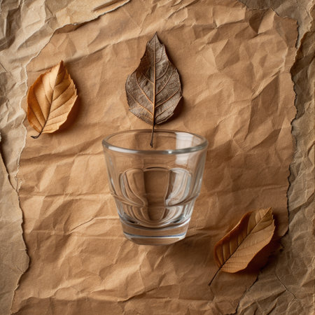 A glass of water with autumn leaves on a crumpled paper background.