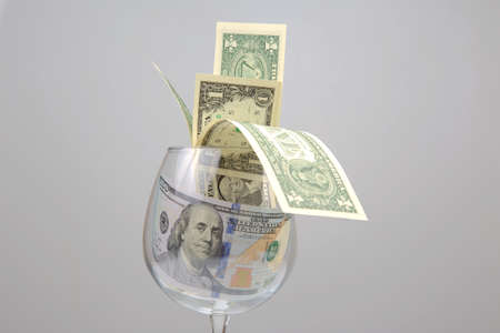 dollar money in an empty wine glass. Online business sale. Financial success in the trading business.