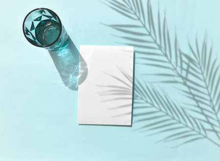 Mock up blank invitation card with color glass on pastel blue background. Sunlight, harsh palm shadow. Summertime minimal still life scene for wedding, spa, vacation or relax.