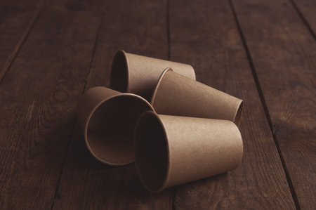 Disposable dark brown kraft paper cups stand on wooden table against brown background