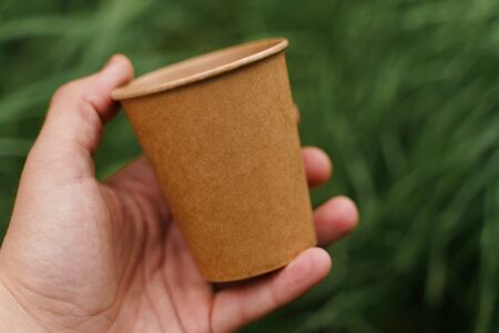 Close up isolated eco-friendly natural coffee cup. Disposable ecological utensils in hands on green grass background. Sustainability of planet. Cardboard glass made of fiber of bamboo and bagasse