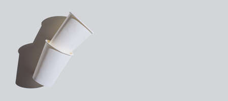 two white paper disposable cups on white background with shadow for banner, copy space