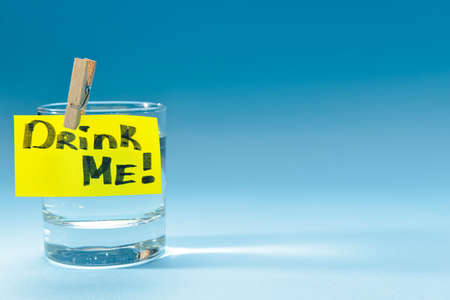 Glass of clean water and paper with text DRINK ME on color background