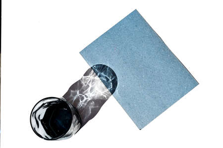 Paper card and glass shadow on white table.