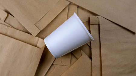 Empty paper package, eco-friendly disposable biodegradable packaging for goods, and empty paper cup. Selective focus. Eco friendly background. Top view. Close-up. Indoors.