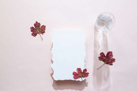 Still life scene with blank sheet paper. Autumn colored leaves and a crystal glass of water, flat lay on a delicate pink background. Minimal autumn composition with interesting shadows, top view