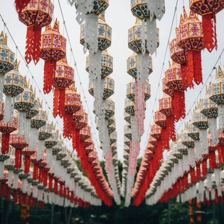 A stunning display of ornate red lanterns hanging elegantly, casting a warm glow. Perfect for capturing the essence of celebration and tradition in any event.