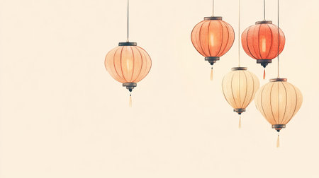A clean illustration of lanterns hanging gracefully, set against a light beige background, with room on the right for a greeting. --ar 16:9 --v 6.1 Job ID: 55f5a508-3041-4e7b-88b8-613c4e059e2d