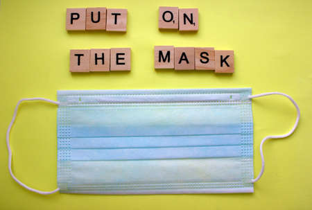 The word Put on the mask is made of wooden blocks and a medical mask. Antiviral medical mask to protect against the virus. ... Medical respiratory bandage. View from above. Warning and reminder.