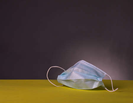 Medical protective masks on yellow and gray background. Disposable surgical face mask cover the mouth and nose. Healthcare and medical concept.