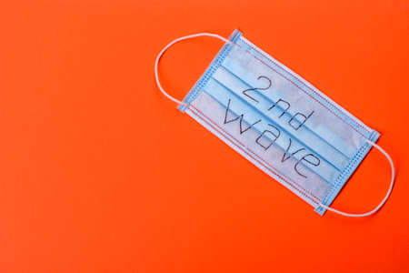 Covid 19 second wave. Covid 19. Medical mask on colors background and the inscription Covid 19 second wave