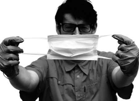 young doctor with glasses wearing surgical mask with antique in black and white